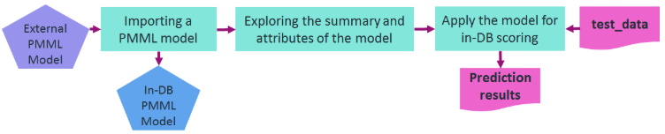 As a database user, you can train ML models in other platforms, convert them to standard PMML format, and then import them for in-database prediction on data stored in relations.