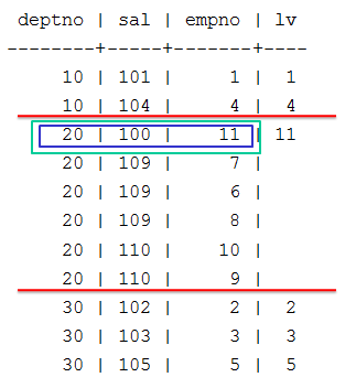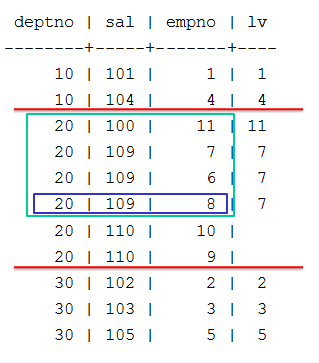 => SELECT deptno, sal, empno,LAST_VALUE(empno) OVER (PARTITION BY deptno ORDER BY sal) AS lv FROM emp;