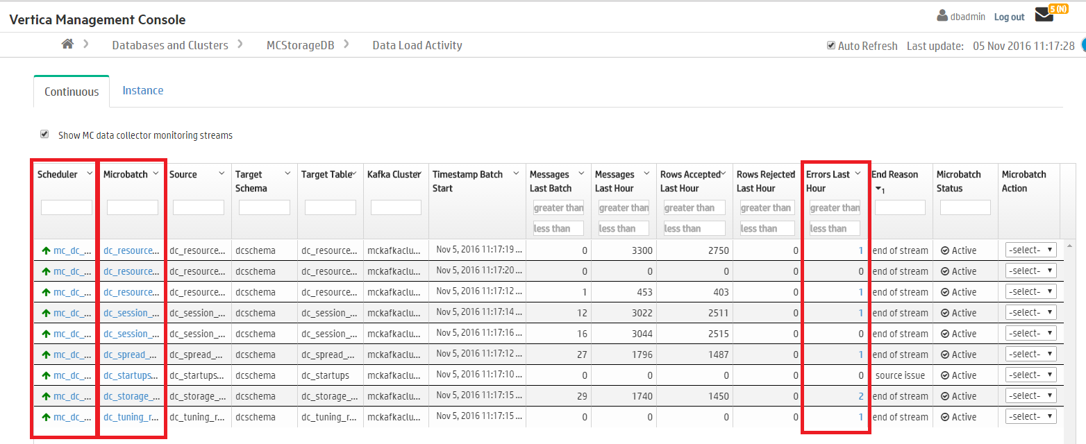 In the Continuous tab, click the labels in the Scheduler, Microbatch, and Errors Last Hour to view additional details about those loading jobs.