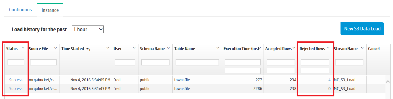 In the Instance tab, you can see a history of your database's one-time loading jobs. For example, you can view instance jobs you created using the COPY command in vsql (see COPY), or instance jobs you created in MC to copy data from an Amazon S3 bucket. (For more about initiating loading jobs in MC, see Loading data from Amazon S3 using MC.)