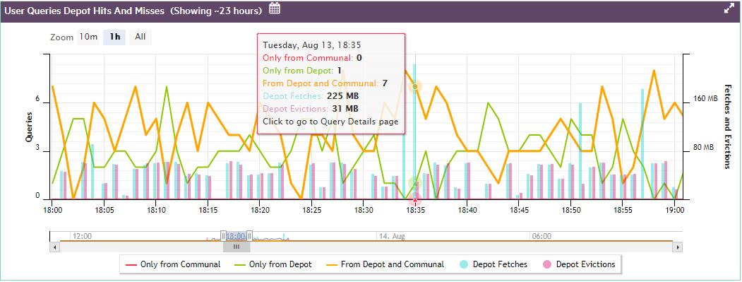 Color-coded graph lines show how many queries were accessing the depot or communal storage, or both, at any given time.