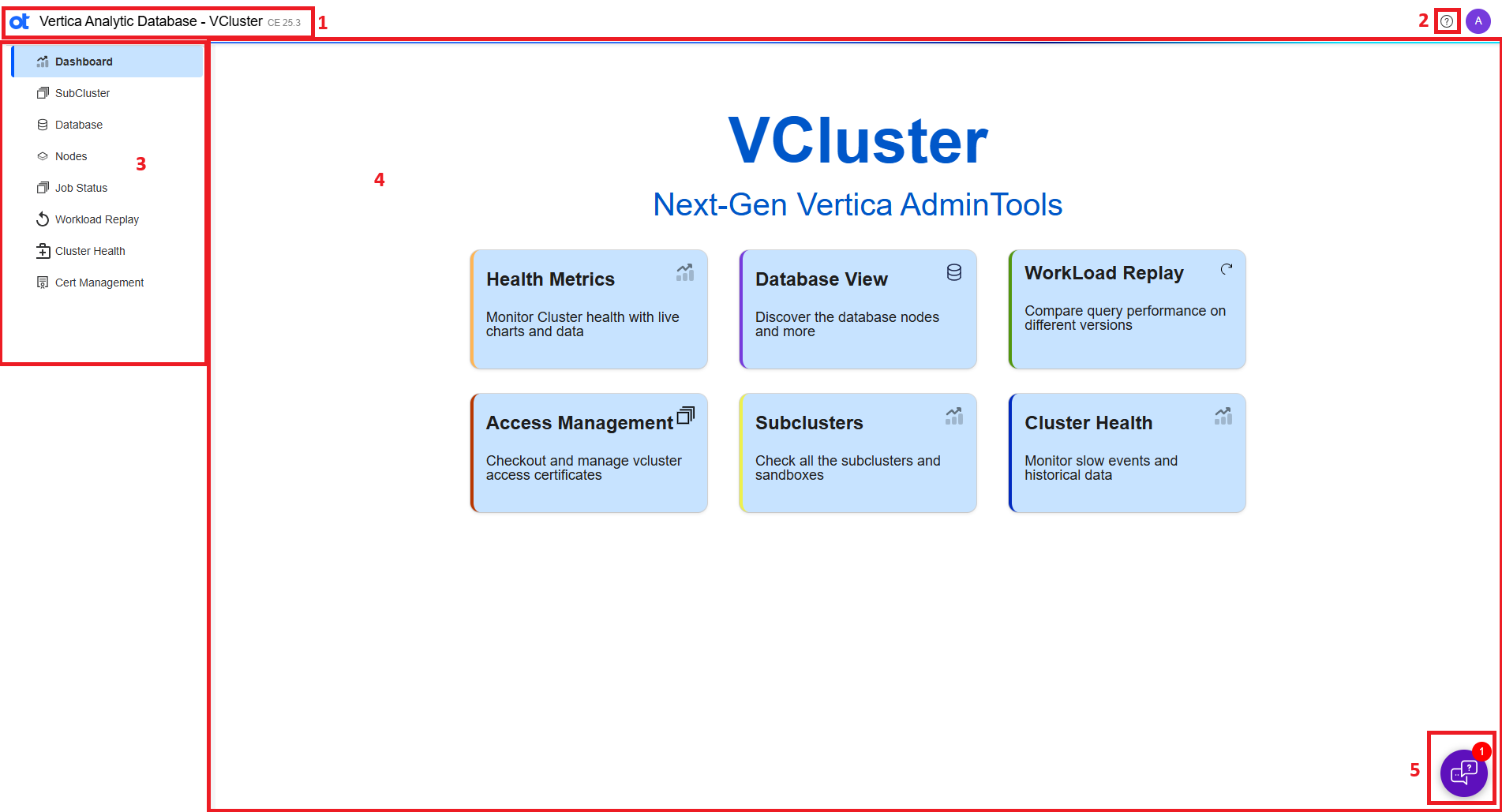 The VCluster UI Dashboard is the default page for the UI. It allows you to show health metrics for your database and links to the other pages in the interface.
