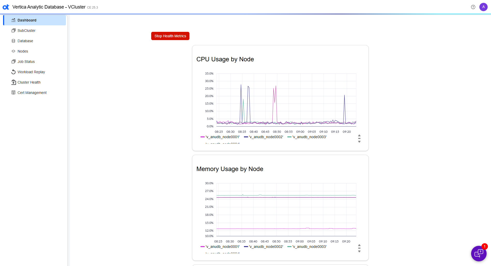 If you click Health Metrics, your dashboard is replaced with the health metrics for your database. Health metrics include: CPU Usage by Node, Memory Usage by Node, Disk I/O by Node, and Free Disk Space by Node. After clicking Health Metrics, anytime you navigate back to the dashboard during that browser session, the health metrics is displayed. To switch back to the default dashboard, click Stop Health Metrics.