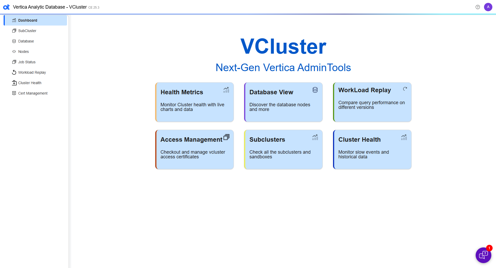 The VCluster UI is a tool for administering a single database. This tool is bundled with OpenText™ Analytics Database installations. VCluster UI works with the VCluster CLI to manage your database. It works with both the EON and Enterprise database types.