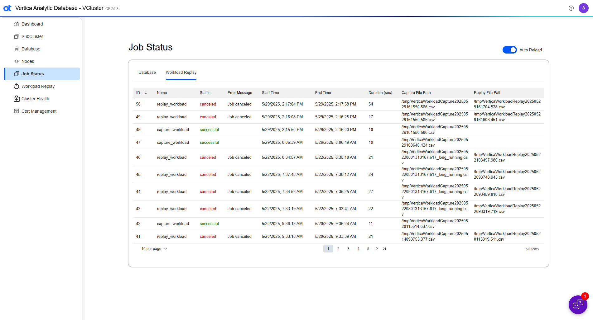 The Job Status page shows you the status of your database jobs and the Workload Replay captures and replays:
