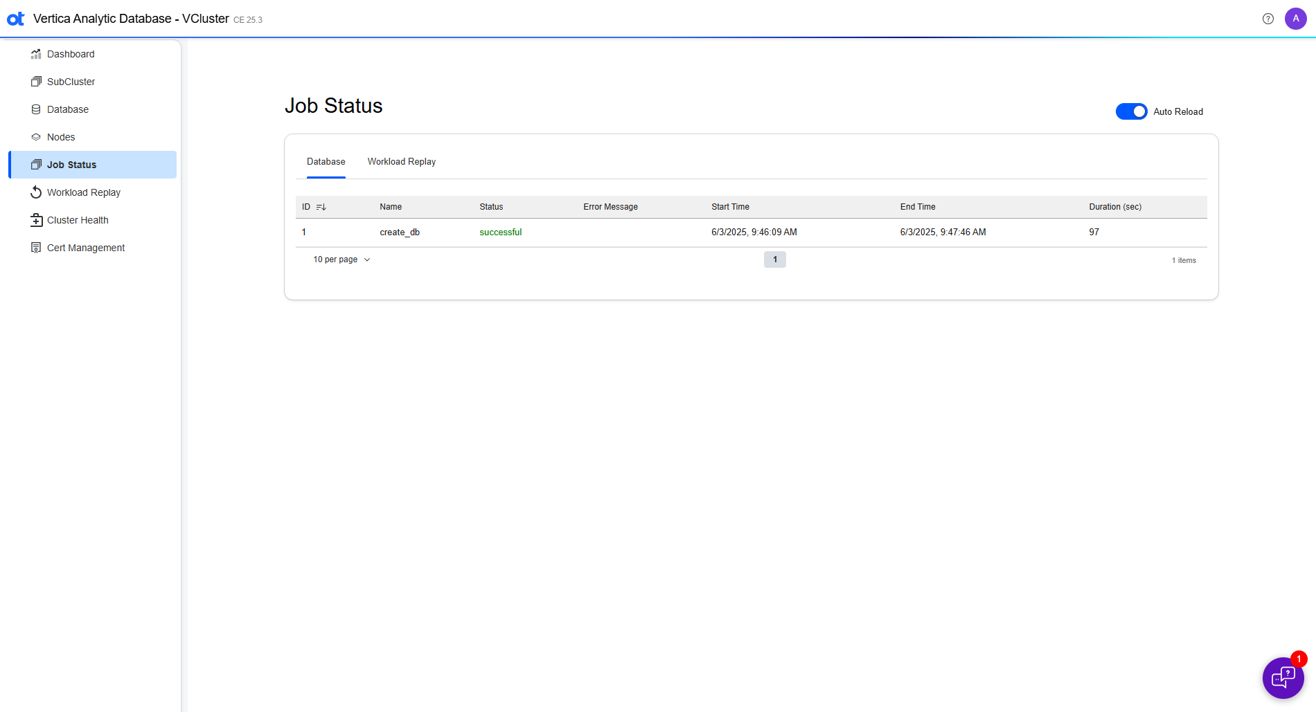 Database shows you the status of jobs from the Database, SubCluster, and Nodes pages. This includes adding a node or subcluster, changing the IP of the database, creating the database, and the other options.