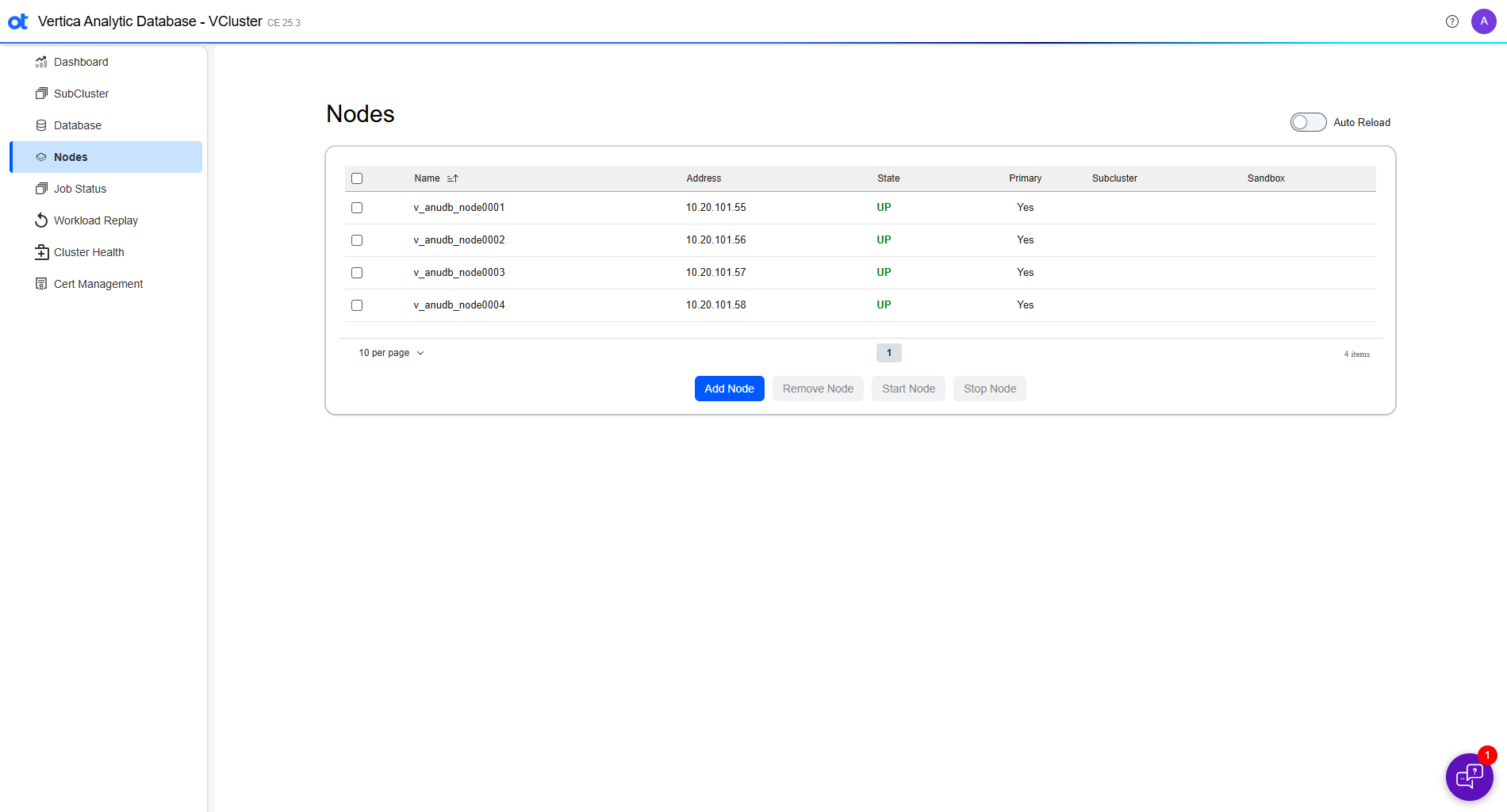 The Nodes page shows you all of your database nodes. You can add, remove, start, and stop nodes on this page.