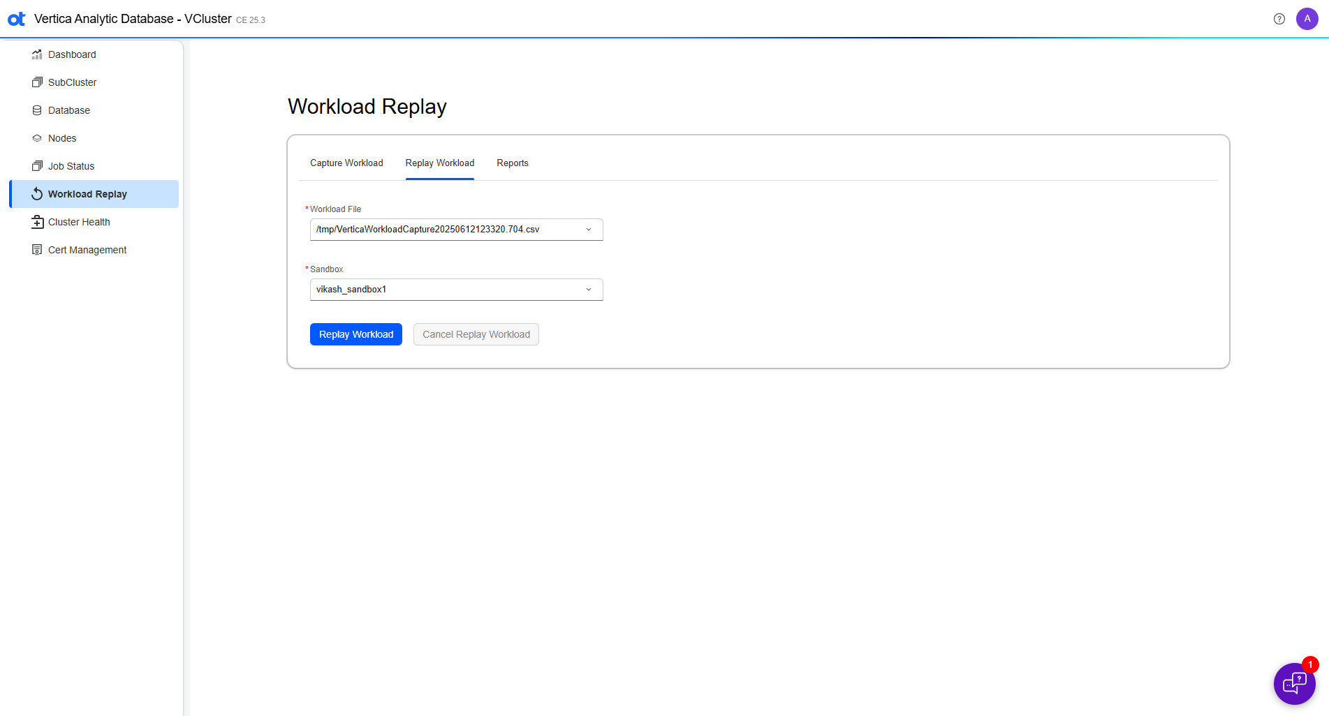 After running a capture, Replay Workload is used to compare the first query run time with a new query run time. Select a sandbox from the dropdown to use for the replay. If no sandbox is present in the dropdown, you can create a sandbox using Create sandbox. You need to know the file path from the Job Status > Workload Replay page to select the capture you want to run against. Select that in the Workload File drop down. In the Sandbox drop down, select the sandbox you are using for the replay, then click Replay Workload. You are redirected to the Job Status > Workload Replay page to see the status of the capture.
