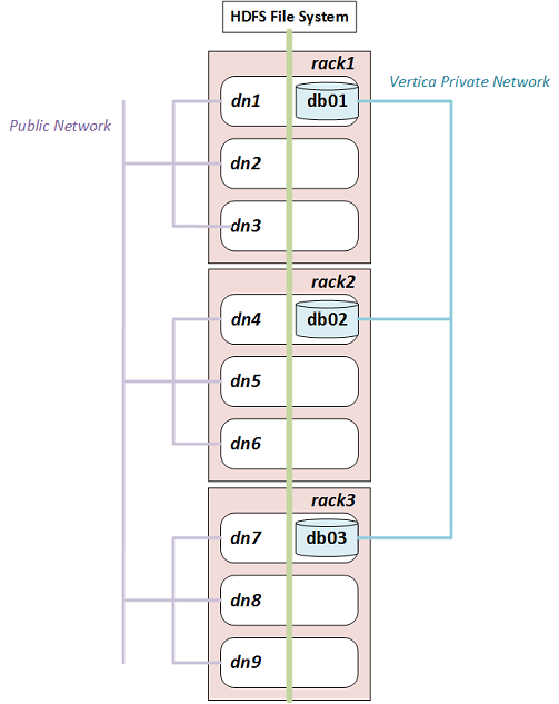 If you configure rack locality, the database uses db01 to query data on dn1, dn2, or dn3, and uses db02 and db03 for data on rack2 and rack3 respectively. Because HDFS replicates data, any given data block can exist in more than one rack. If a data block is replicated on dn2, dn3, and dn6, for example, the database uses either db01 or db02 to query it.