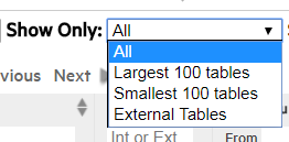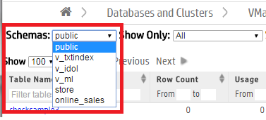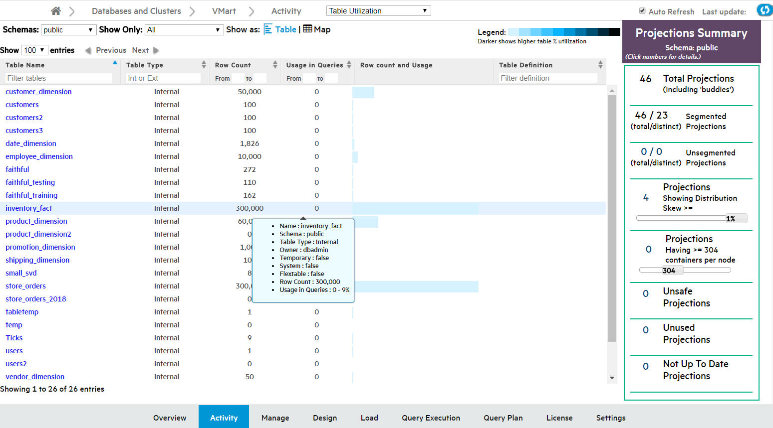 The storage database uses a customized schema, named dcschema. You can monitor these tables on MC, using the Table Utilization chart on the storage database's Activity tab. The Table Utilization chart lists all the tables in dcschema and their details, such as row counts and column properties. You can sort by row count to determine if certain tables use more disk space on your storage database. SeeMonitoring table utilization and projections with MC.