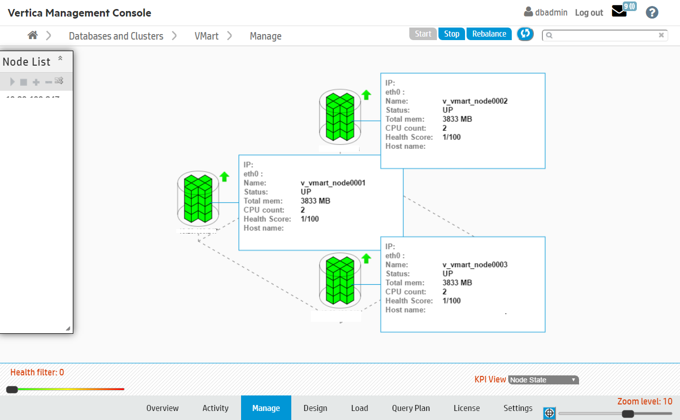 If you have a large cluster, where it might be difficult to view dozens to hundreds of nodes on the MC interface, you can filter what you see. The Zoom filter shows more or less detail on the cluster overall, and the Health Filter lets you view specific node activity; for example, you can slide the bar all the way to the right to show only nodes that are down. A message next to the health filter indicates how many nodes in the cluster are hidden from view.