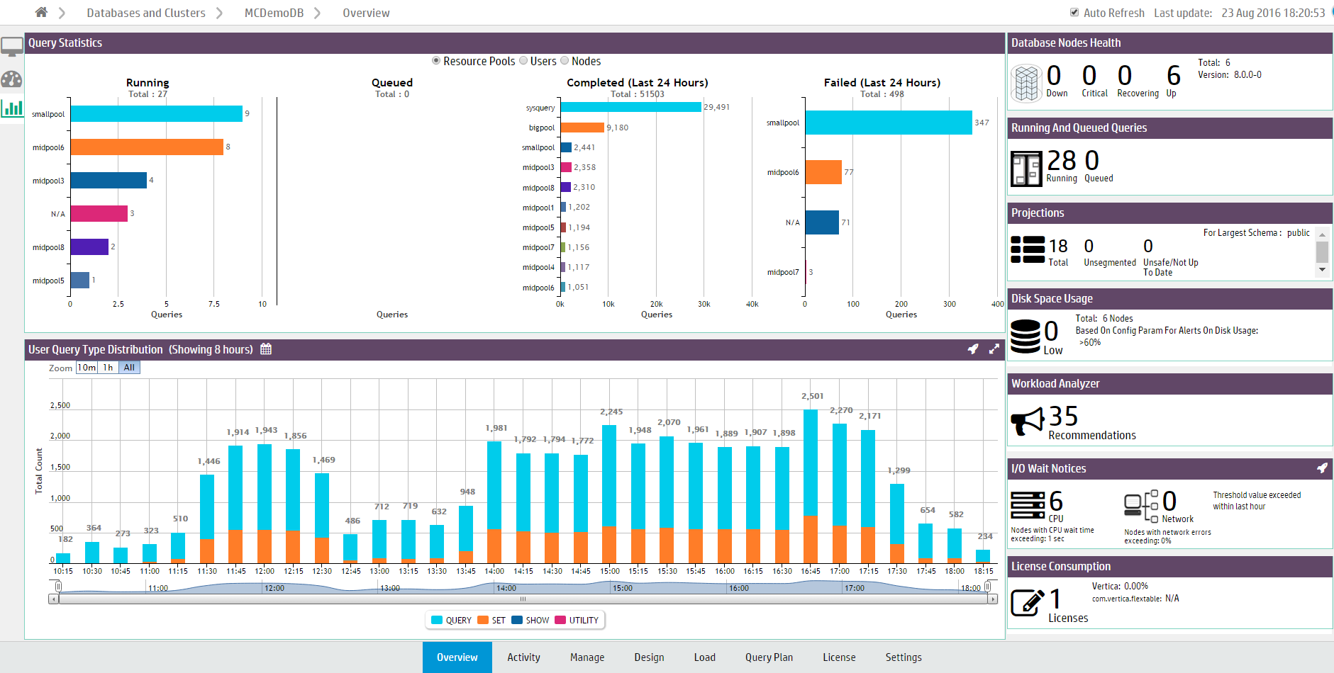Running and Queued Queries displays current queries in the database. Click the query values to open the Query Monitoring charts.