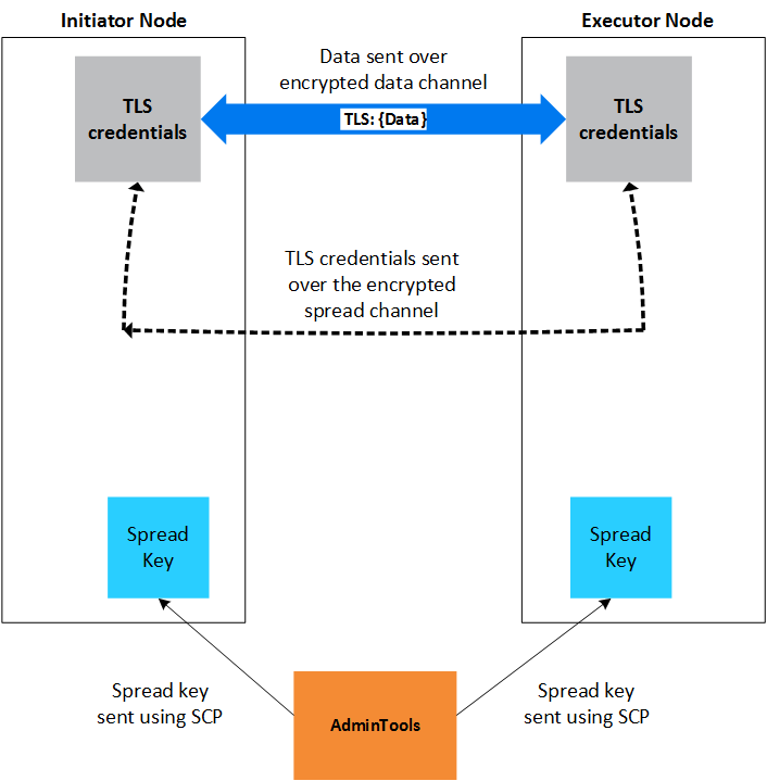 Admintools generates or retrieves the spread key to encrypt all traffic on the control channel and ships the spread key to all nodes. OpenText™ Analytics Database uses TLS to encrypt all traffic on the data channel. TLS credentials are shared between nodes over the encrypted control channel.