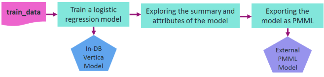 Here is an example for training a model and then exporting it in PMML format. The following diagram shows the workflow of the example. We use vsql to run this example.
