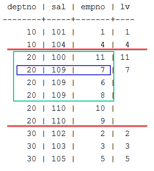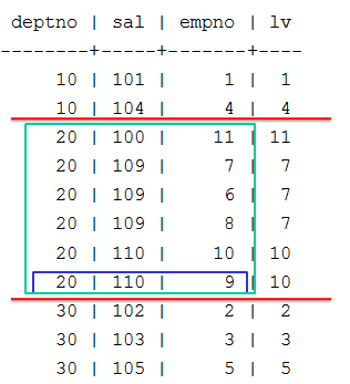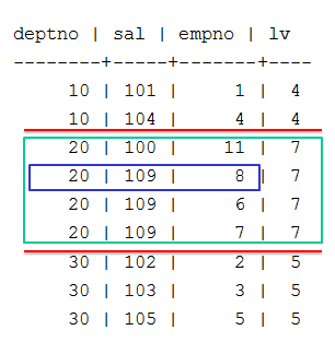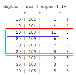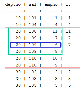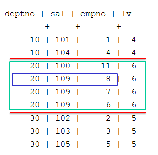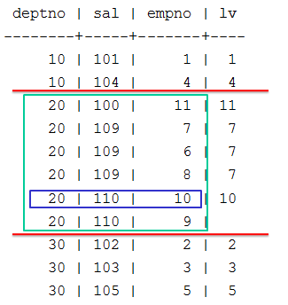 => SELECT deptno, sal, empno,LAST_VALUE(empno) OVER (PARTITION BY deptno ORDER BY sal) AS lv FROM emp;