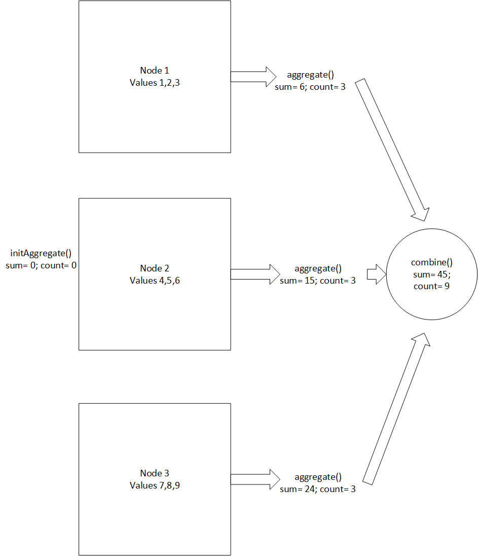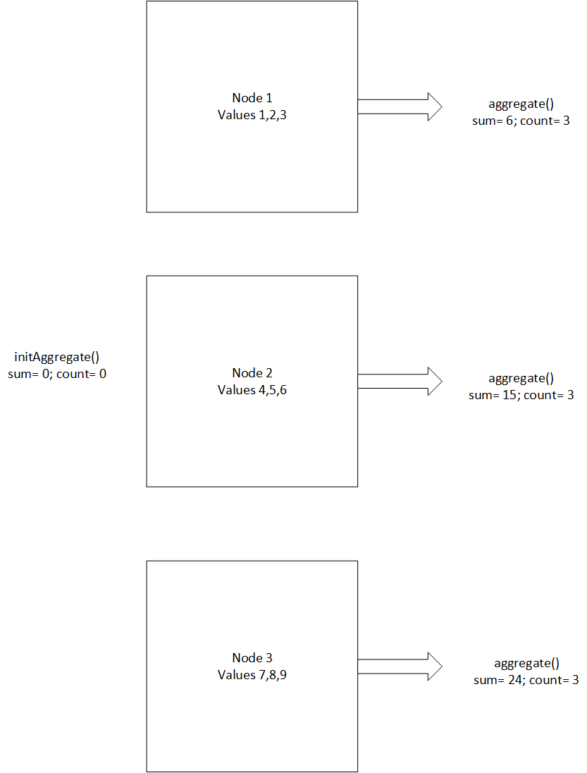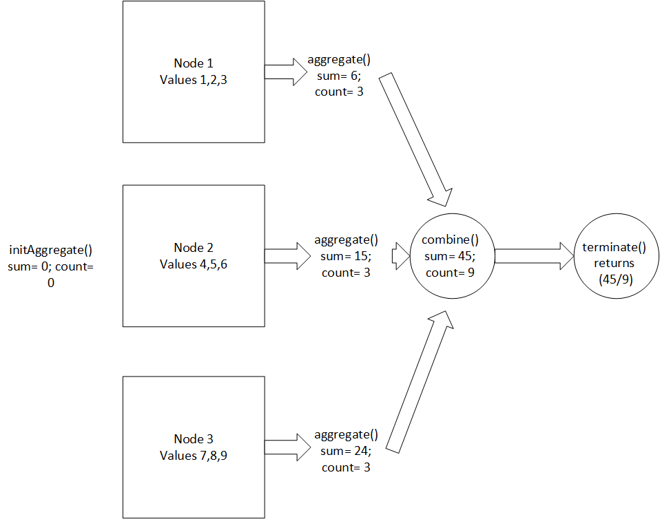 This example adds the input argument values in the aggregate() method and keeps a counter of the number of values added. The server runs aggregate() on every node and different data chunks, and combines all the individually added values and counters in the combine() method. Finally, the average value is computed in the terminate() method by dividing the total sum by the total number of values processed.