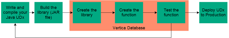 If you do not have access to a database test environment, you can install Vertica on your development machine and run a single node. Each time you rebuild your UDx library, you need to re-install it into the database. The following diagram illustrates the typical development cycle.