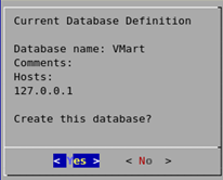 $ admintools -t create_db --data_path=/home/dbadmin --catalog_path=/home/dbadmin --database=vdb --password=vertica --hosts=localhost