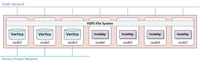 With co-located clusters, OpenText™ Analytics Database is installed on some or all of your Hadoop nodes. The database nodes use a private network in addition to the public network used by all Hadoop nodes, as the following figure shows: