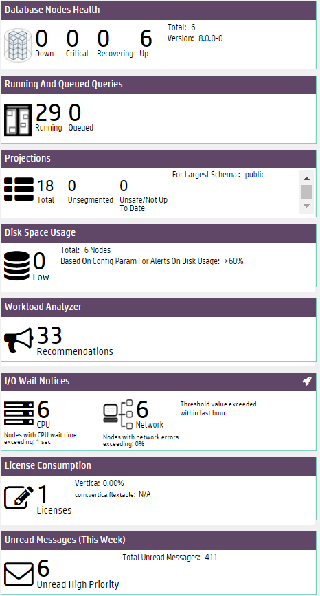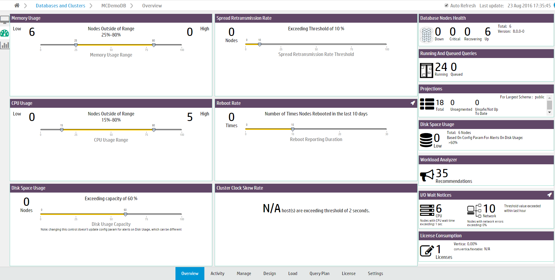 Management Console (MC) is the OpenText™ Analytics Database in-browser monitoring and management tool. Its graphical user interface provides a unified view of your database operations. Through user-friendly, step-by-step screens, you can create, configure, manage, and monitor your databases and their associated clusters. You can use MC to operate your database in Eon Mode or in Enterprise Mode. You can use MC to provision and deploy an Eon Mode database.
