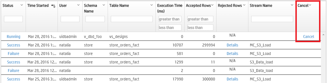 If a loading job is in progress, you can cancel it using the Cancel option in the Load History tab's Cancel column. Click Cancel to cancel the loading job. When you cancel a job, the database rolls back all rows and does not commit any data to the target table.