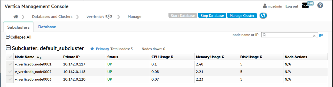 Using MC to monitor your cluster, you can monitor the nodes in your subcluster, load data, run queries, and perform all other monitoring tasks for subclusters and nodes.