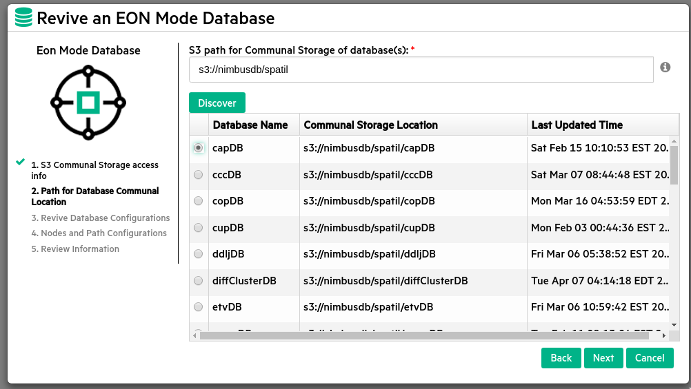 S3 path for Communal Storage of database(s) Enter the complete S3 bucket URL for the database you wish to revive, in the following format: