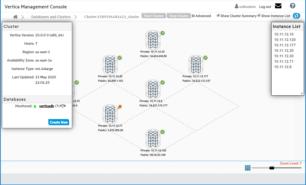 In the screen capture below, the Cluster page shows a 7-node cluster, which was provisioned using the Cluster Creation wizard. Use the wizard to create an Eon Mode or Enterprise Mode.