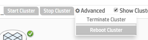 Reboot Cluster: Restart all instances in the cluster. Available under the Advanced menu at the top of the page. Note: Reboot Cluster is currently available only on AWS.