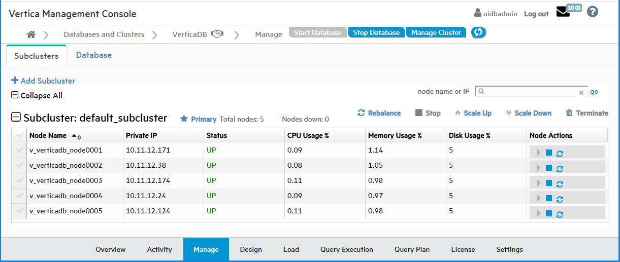 In Eon Mode on cloud platforms, you can use the Manage > Subclusters tab to add subclusters, rebalance your subclusters, stop and start subclusters, scale subclusters up or down, or terminate a subcluster. You can also stop or start a node, or restart a database node and its underlying instance.