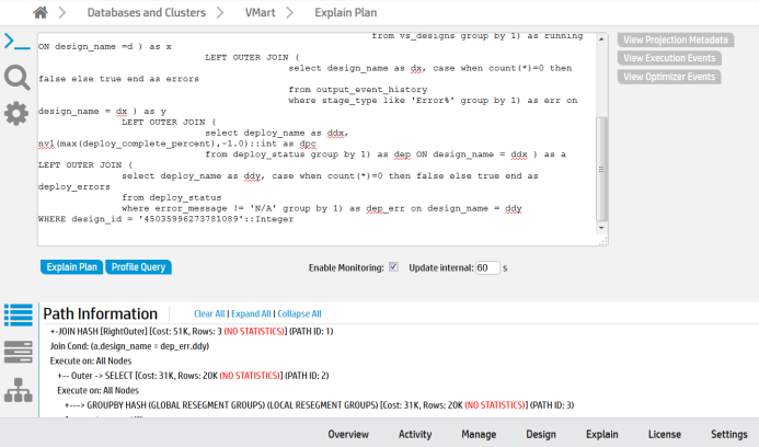 In the Detail page for query-related charts on the database's Activity page, click Explain next to a query to view a plan for that query.