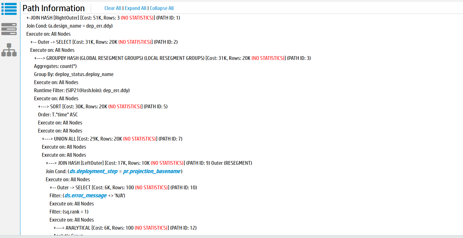 The Path Information view displays the query plan path. You can expand or collapse the view to see different levels of detail. To view metadata for a projection or a column, click the object name in the path output. A pop-up window displays the metadata, if it is available.