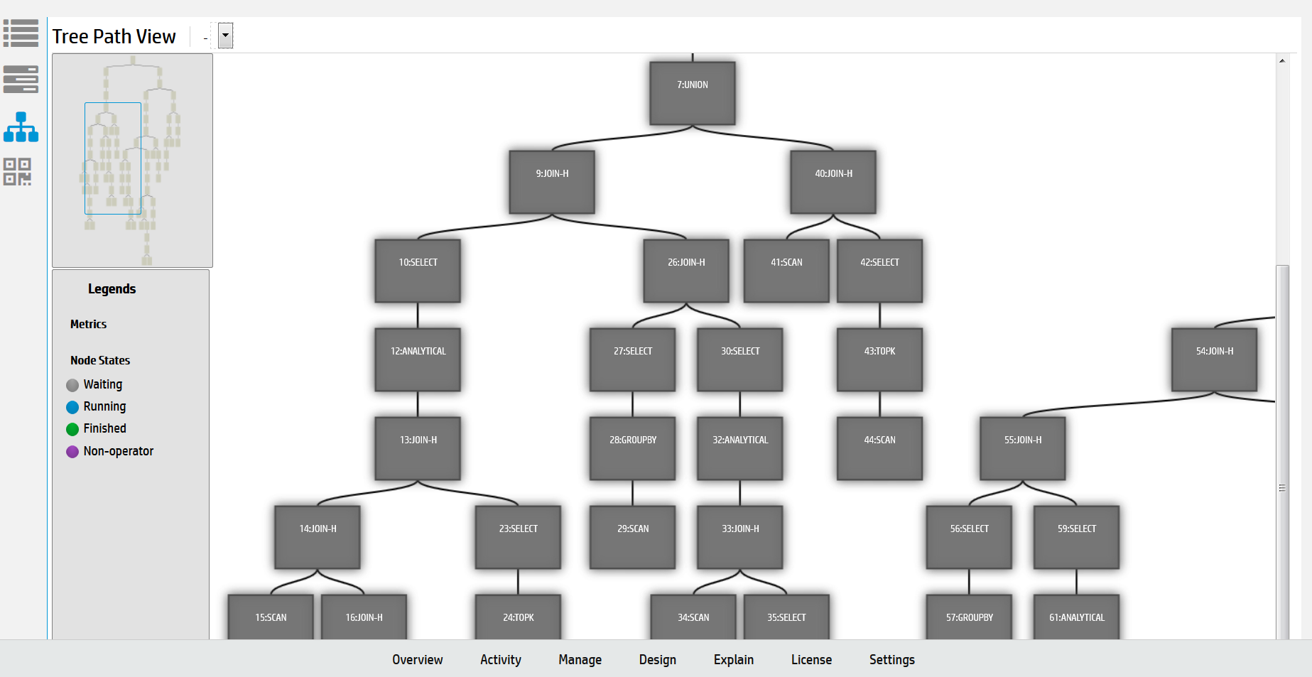 The Tree Path view details the query plan in the form of a tree. When you run EXPLAIN, the tree view does not contain any metrics because the query has not yet executed.