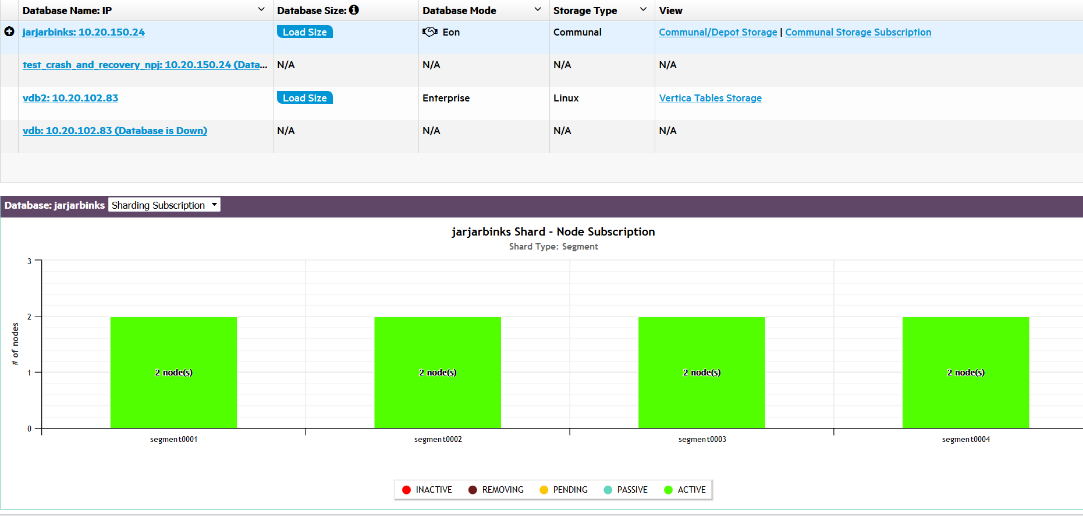 For a database running in Eon Mode, MC also displays bar charts in the Storage View that illustrate shard subscription status. Use these charts to determine if your current subscription layout is optimal for querying your Eon Mode database. For information about using subscription status charts, see Monitoring subscription status in Eon Mode.