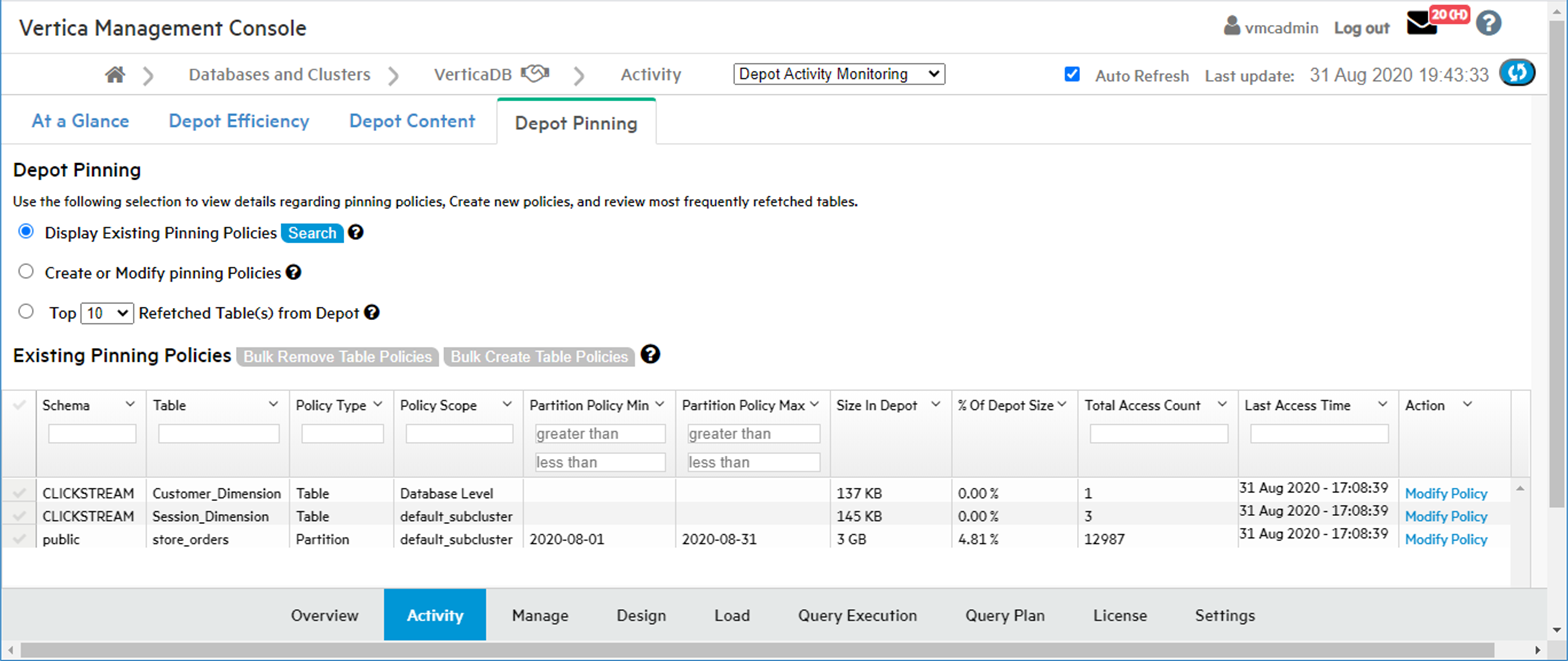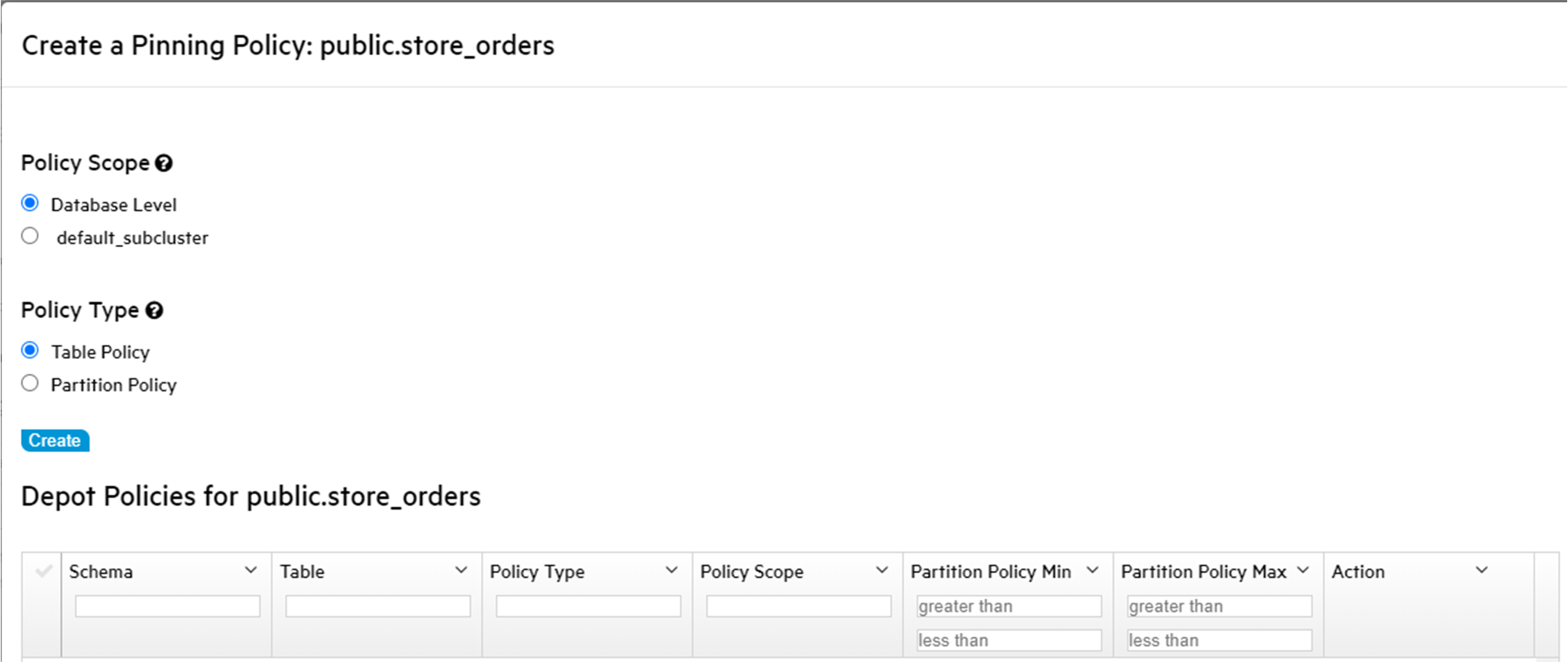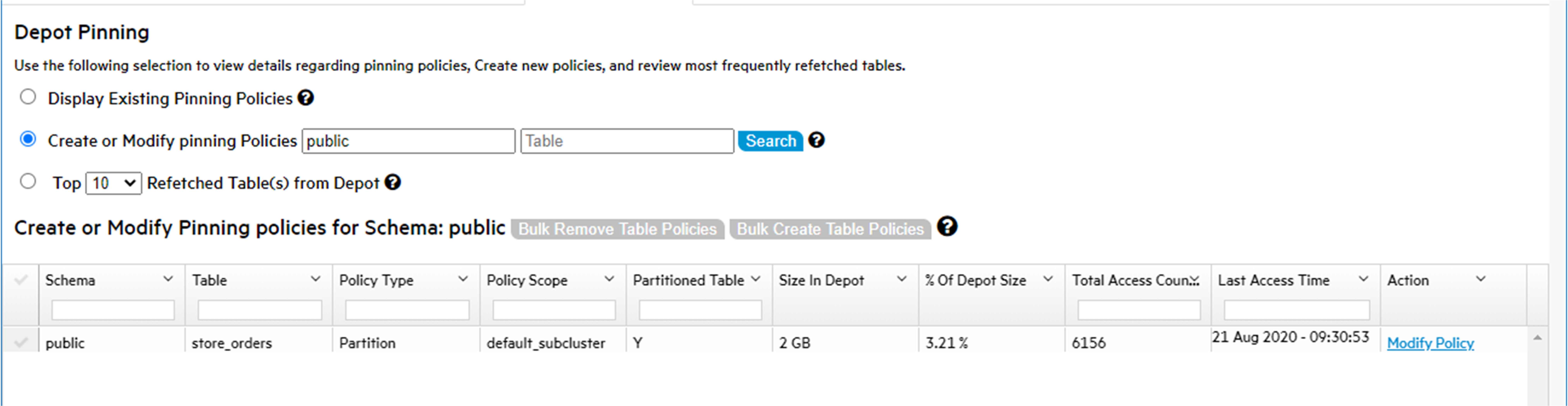 Create or remove pinning policies on individual tables and partitions by clicking on the desired action—Create Policy or Modify Policy.