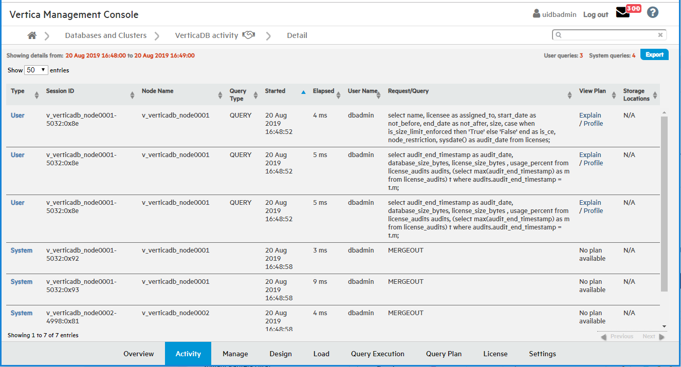 All queries that ran during the selected timespan. These queries executed the API calls listed for that timespan on the Communal Storage Access Calls chart.