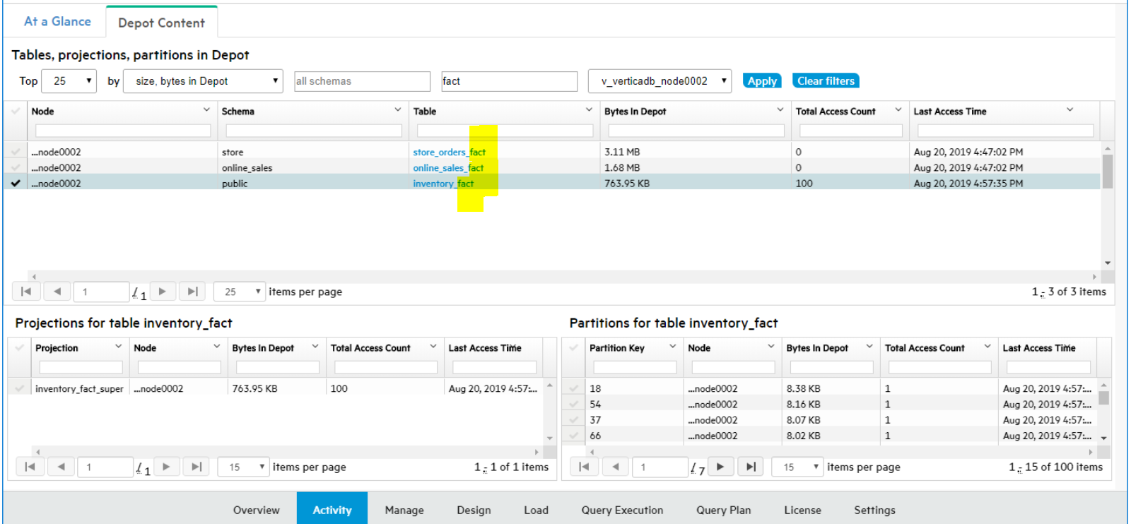 To display details on the projections and partitions for a specific table that are accessing the depot, select a row in the top pane of the Depot Content tab.