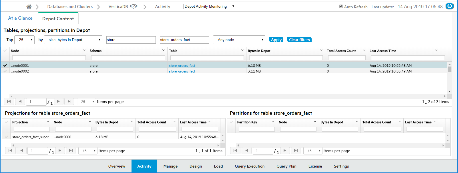 For each projection and each partition, MC also displays the total number of times, that the projection or partition has accessed the depot on that node, and the last access time.