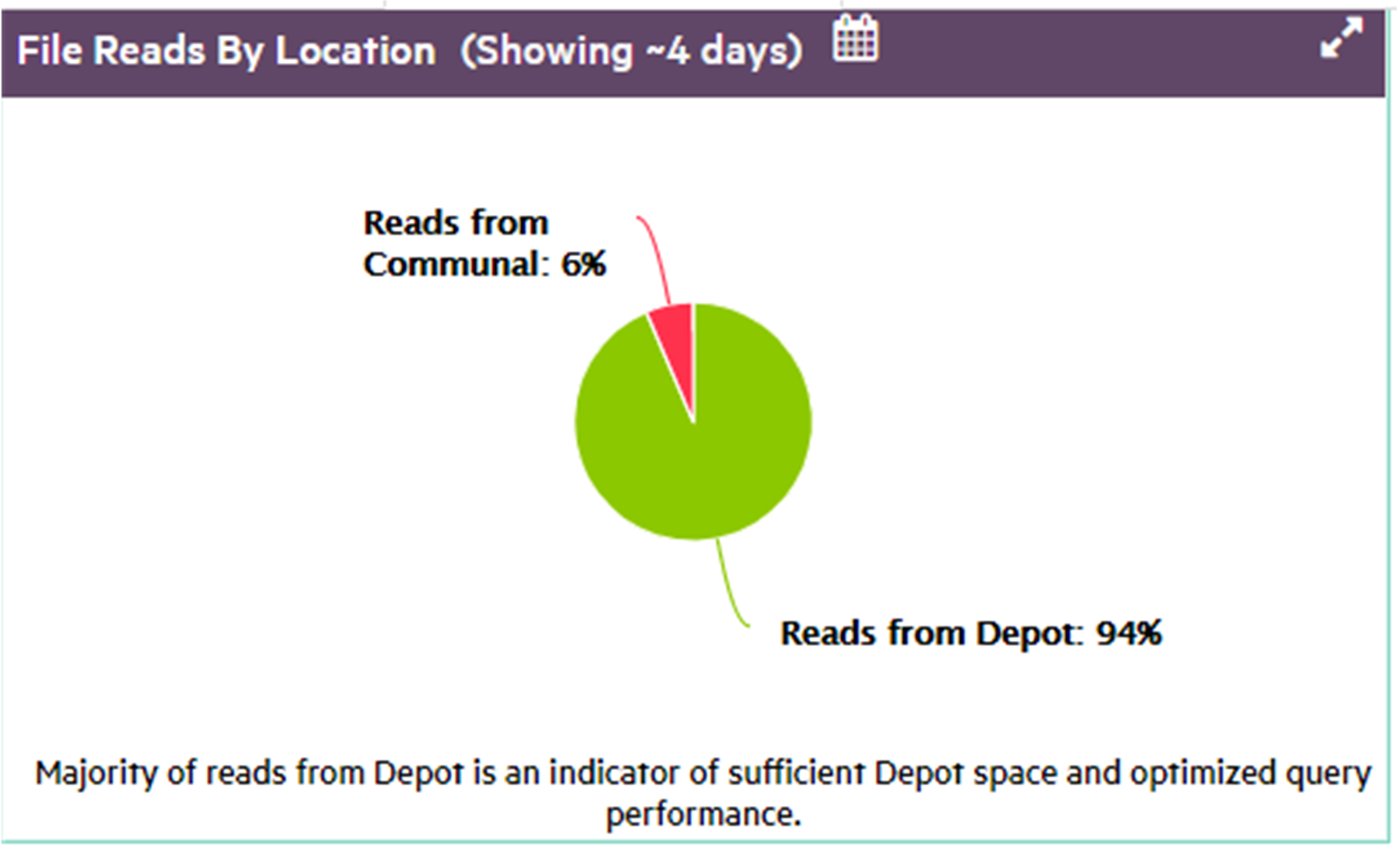 Shows the percentage of reads from depot and communal storage over the specified time span. In general, you want the majority of queries and other read operations to obtain their data from the depot rather than communal storage, as verified by the chart below.If communal storage shows a large percentage of file reads, it's likely that you need to increase the depot size.