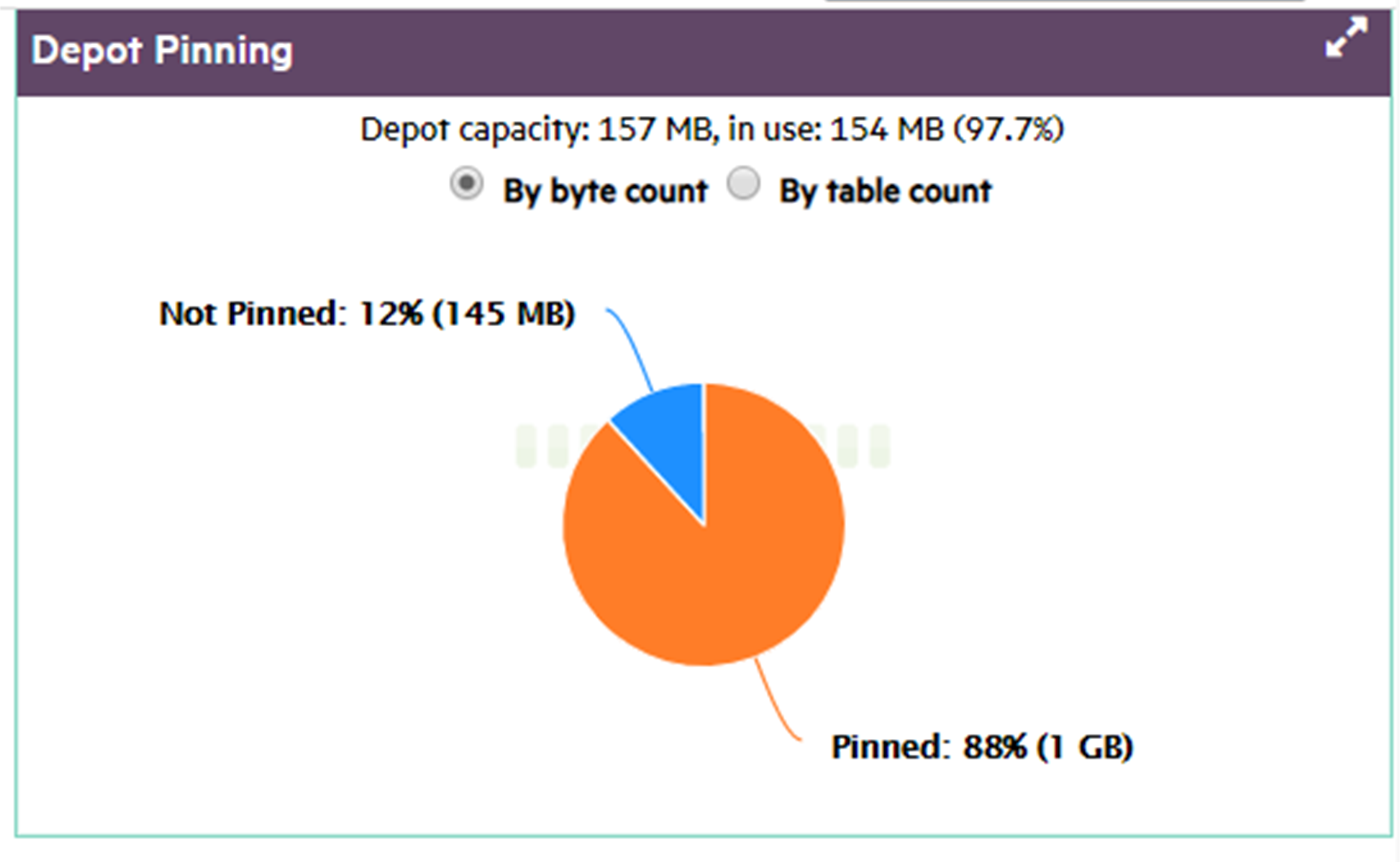 It's often advisable to pin a table or table partitions whose data is frequently queried. Doing so reduces their exposure to eviction from the depot. However, you should also be careful not to use up too much depot storage with pinned data. If too much depot space is claimed by pinned objects (as shown below), the depot might be unable to handle load operations on unpinned objects.