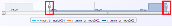 At the bottom of the chart is a summary bar that shows a quick overview of the catalog memory over time. Move the sliders on either side of the chart to zoom in on a specific time frame in the chart. When zoomed in, you can use the scrollbar to move forward or backward in time.