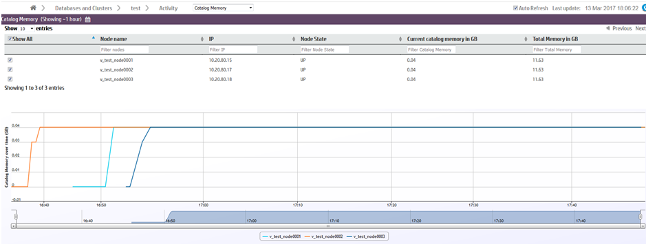 In the image below, catalog memory begins at 0GB for all three nodes. Over the next twenty minutes, catalog memory increases to 0.04GB in the second node (orange), then the first node (cyan), and finally in the third node (dark blue). Starting at 16:55, note that the three overlapping node lines appear as one line when all three nodes have the same catalog memory.