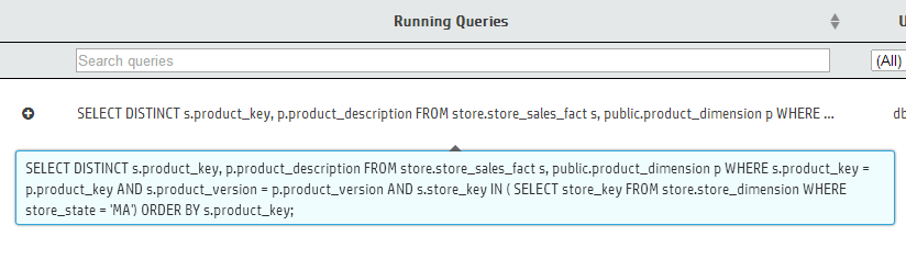 The Query Monitoring activity page displays the status of recent and currently running queries, and resource information by user and node. For Eon Mode databases, you can also display the status of queries by subcluster. From this page, you can profile a query or cancel a running query.