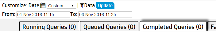 There may be a large number of results for Completed and Failed Queries. Use the Customize section at the top of these two tabs to further filter your chart results. For either tab, you can select a custom date and time range for your results.