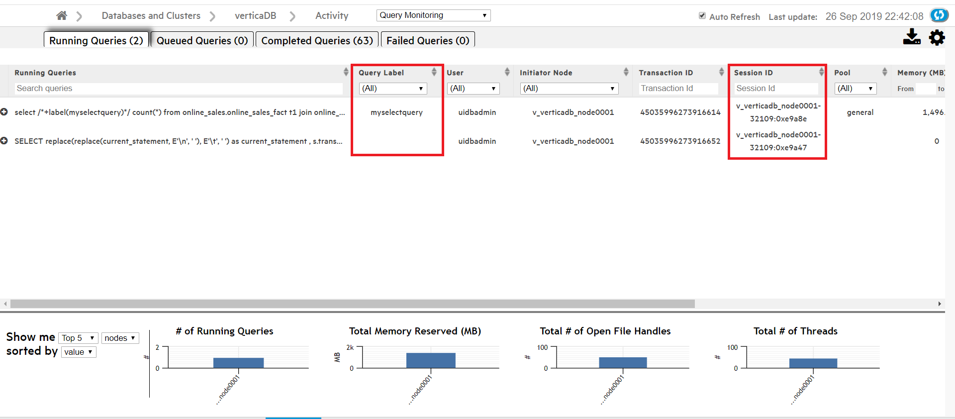 The Query Monitoring Activity > Running Queries page includes columns that display the Session ID and Client Label for each query. You can sort the queries by Session ID or Client Label, or use the search field below either column to search for queries with a specific Session ID or Client Label.