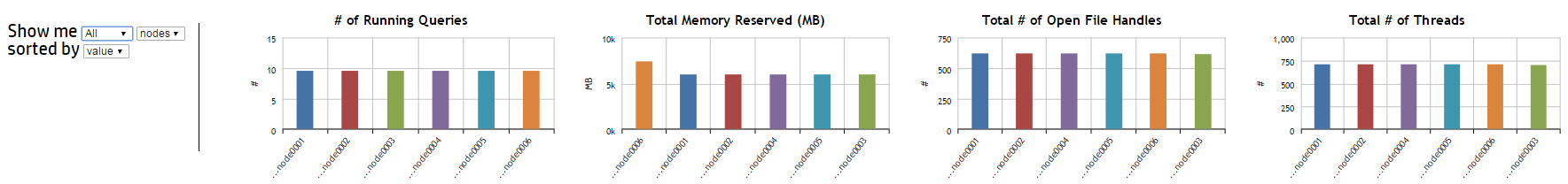 The four bar charts at the bottom of the page display aggregate query usage by node or user. Hover over a bar with your cursor to see its value. When sorted by value, the left-most bar in each chart represents the node or user with the highest value.