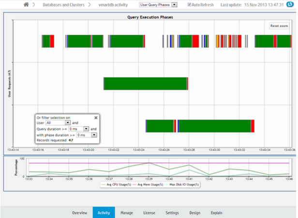 The User Query Phases chart provides information about the query execution phases that a query goes through before completion. Viewing this chart helps you identify at a glance queries possibly delayed because of resource contention.