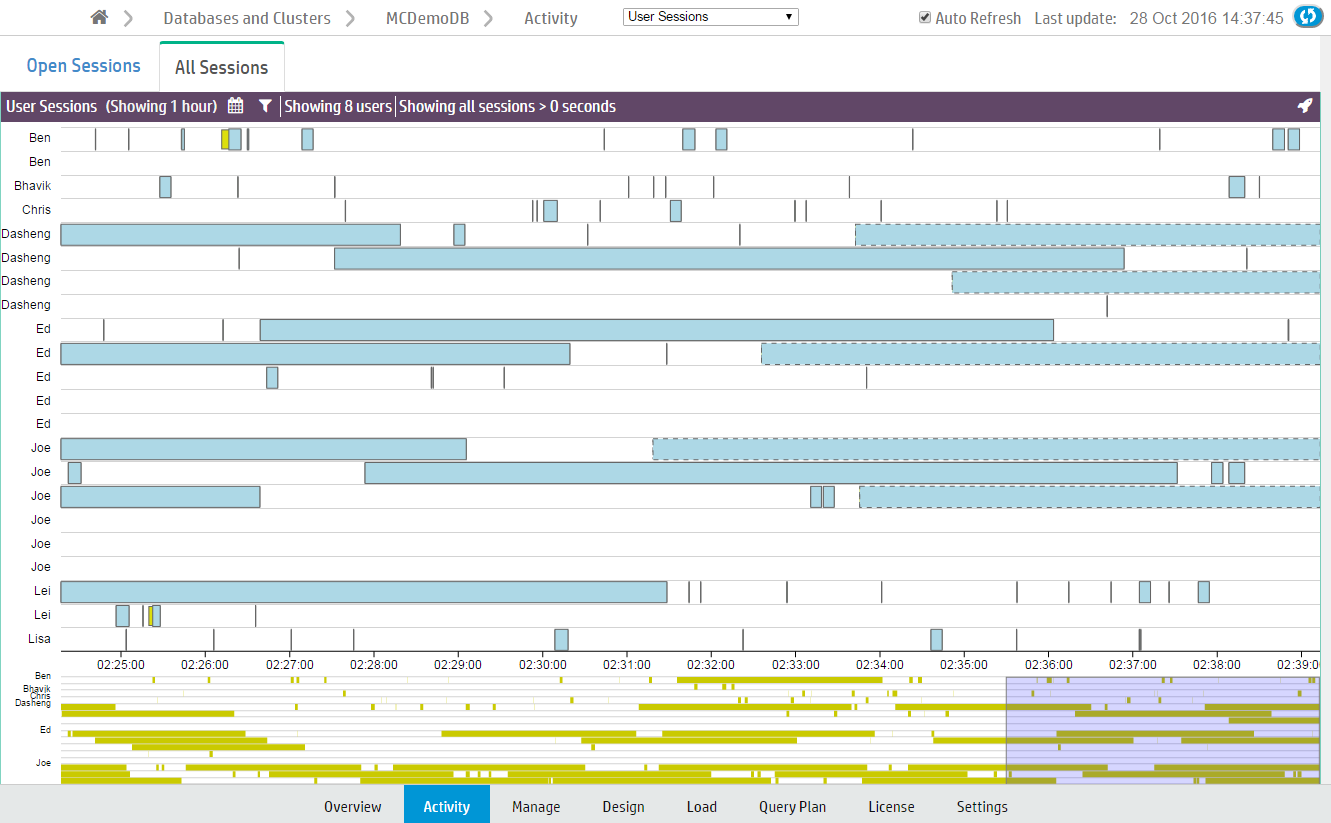 Yellow bars represent user (system) sessions. If you click a yellow bar, MC opens a Detail page that shows all queries that ran or are still running within that session.
