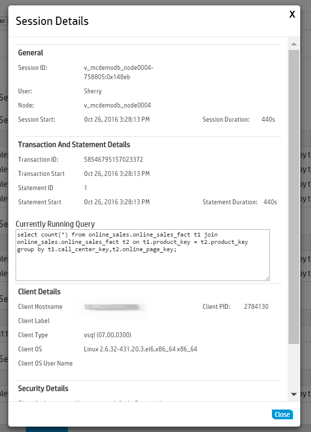When you hover your mouse over a transaction bar, a dialog box provides summary information about that request, such as which user ran the query, how long the transaction took to complete, or whether the transaction is still running.