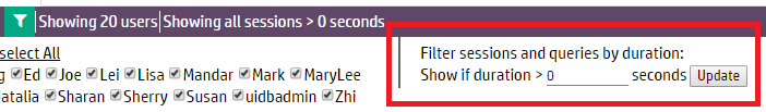 ) at the top of the page. The Filter sessions and queries by duration field appears below. Enter the minimum session length (in seconds) to display on the chart and click Update.